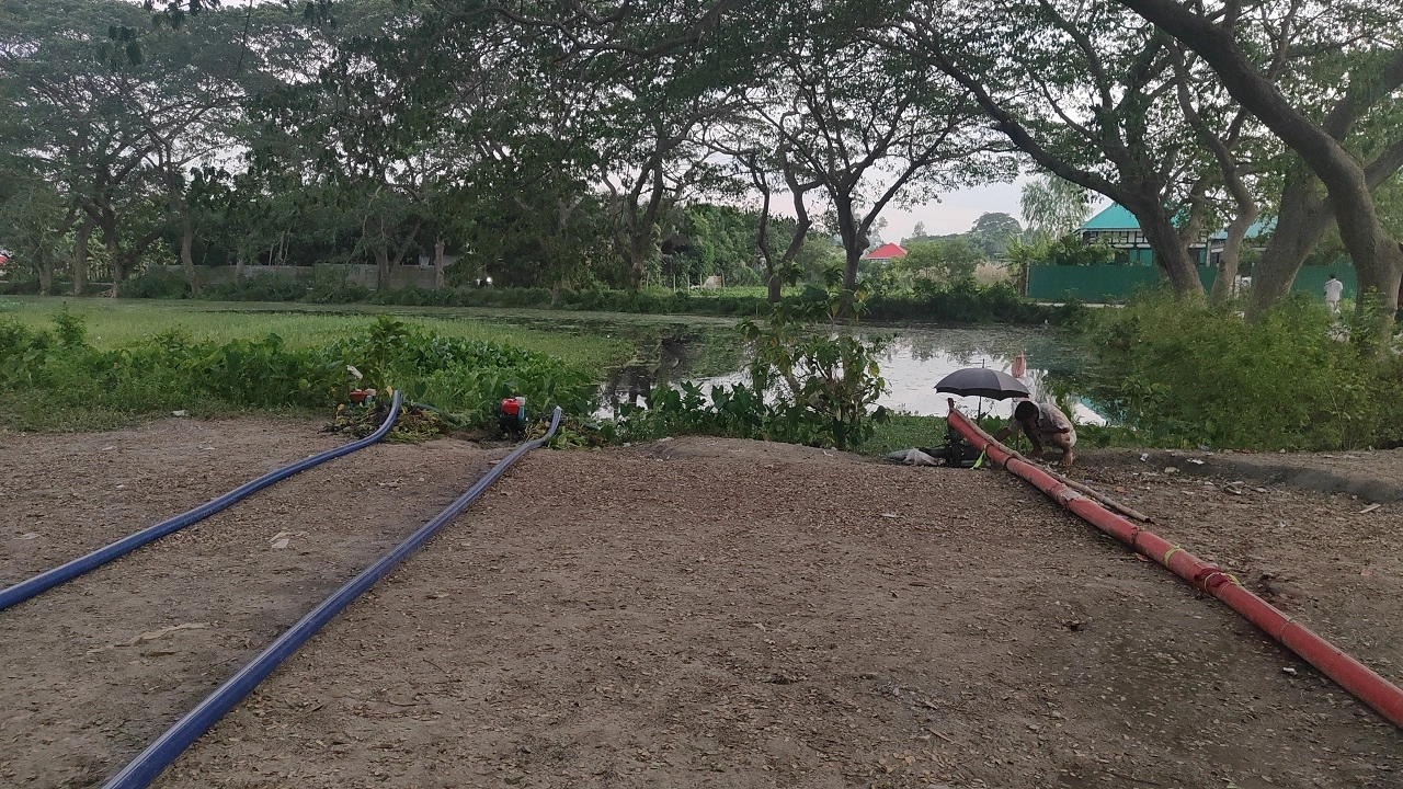 শুক্রবার (৩১ অক্টোবর) বিকেলে সরেজমিনে দেখা যায়, মাঠের পানি অপসারণে তিনটি সেচ পাম্প একযোগে কাজ করছে।