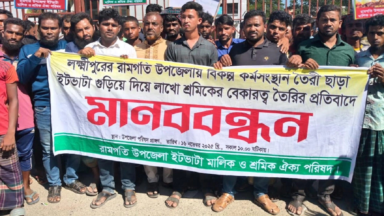 বিকল্প কর্মসংস্থান সৃষ্টি না করে ইটভাটা গুড়িয়ে দেওয়ার প্রতিবাদে লক্ষ্মীপুরের রামগতিতে মানববন্ধন অনুষ্ঠিত হয়েছে।