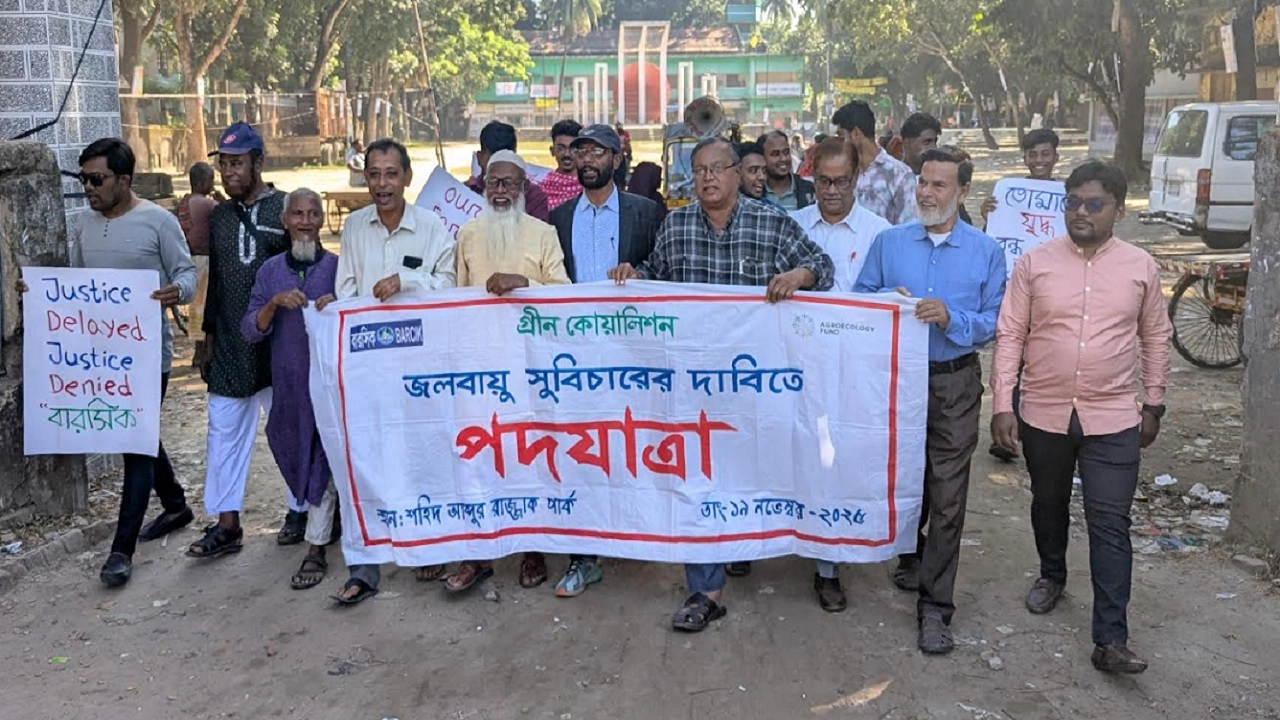 সাতক্ষীরায় জলবায়ু সুবিচারের দাবিতে পদযাত্রা অনুষ্ঠিত হয়েছে। এই পদযাত্রা থেকে জলবায়ু পরিবর্তনের প্রভাব মোকাবেলা ও উপকূল রক্ষায় বিশেষায়িত প্রতিষ্ঠান গঠনের দাবি জানানো হয়। বুধবার (১৯ নভেম্বর) সাতক্ষীরা শহরের শহীদ আব্দুর রাজ্জাক পার্ক থেকে গ্রীন কোয়ালিশন, গবেষণা প্রতিষ্ঠান বারসিক এবং শিক্ষা সংস্কৃতি ও বৈচিত্র্য রক্ষা টিমের যৌথ উদ্যোগে এই পদযাত্রা বের হয়। পদযাত্রাটি বিভিন্ন সড়ক প্রদক্ষিণ করে পুনরায় একই স্থানে ফিরে আসে। সেখানে পদযাত্রা পরবর্তী সমাবেশে বক্তারা উপকূলীয় অঞ্চলে লবণাক্ততা বৃদ্ধি, জীবিকার সংকট, ঘূর্ণিঝড়-জলোচ্ছ্বাসের ঝুঁকি এবং মিঠাপানির ঘাটতির দীর্ঘমেয়াদি সংকট তুলে ধরেন। তারা বলেন, দেশের সবচেয়ে ঝুঁকিপূর্ণ হিসেবে বিবেচিত হলেও উপকূলীয় অঞ্চলের উন্নয়নে কোনো বিশেষায়িত প্রতিষ্ঠান নেই। উপকূল রক্ষা, পরিকল্পিত উন্নয়ন ও ক্ষতিগ্রস্ত মানুষের পুনর্বাসনে উপকূল উন্নয়ন বোর্ড গঠন করা এখন সময়ের দাবি। বক্তার জলবায়ু পরিবর্তনে ক্ষতিগ্রস্ত উপকূলীয় জনগোষ্ঠীর ন্যায্য ক্ষতিপূরণ ও পুনর্বাসন নিশ্চিতকরণ, আন্তর্জাতিক পরিম-লে জলবায়ু তহবিল বৃদ্ধি, সাতক্ষীরাসহ উপকূলীয় এলাকার লবণাক্ততা প্রতিরোধ, মিঠাপানির সংরক্ষণ ও টেকসই কৃষি সহায়তা বাড়ানো, জেলেদের নিরাপত্তা, জীবিকা রক্ষা ও দুর্যোগ সহনশীল অবকাঠামো নির্মাণে বিশেষ বরাদ্দ প্রদান এবং যুব, নারী ও প্রান্তিক জনগোষ্ঠীর অংশগ্রহণ নিশ্চিত করে স্থানীয় জ্ঞানভিত্তিক টেকসই জলবায়ু পরিকল্পনা প্রণয়নের দাবি জানান। এই কর্মসূচিতে সভাপতিত্ব করেন সাতক্ষীরা জেলা নাগরিক কমিটির আহ্বায়ক আজাদ হোসেন বেলাল।