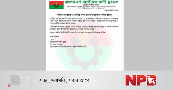 বাংলাদেশ কেন্দ্রীয় যুবদলের সহ-দপ্তর সম্পাদক মিনহাজুল ইসলাম ভূঁইয়ার স্বাক্ষরিত এক বিজ্ঞপ্তিতে এ নির্দেশনা দেওয়া হয়। বিজ্ঞপ্তিতে বলা হয়, পরবর্তী নির্দেশ না দেওয়া পর্যন্ত নবীনগর উপজেলা ও এর আওতাধীন সকল ইউনিয়ন যুবদলের কার্যক্রম স্থগিত থাকবে।