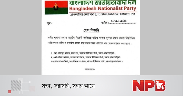 প্রেস বিজ্ঞপ্তিতে আরও বলা হয়, দলীয় শৃঙ্খলা রক্ষায় বিএনপি সবসময় কঠোর অবস্থানে রয়েছে এবং ভবিষ্যতেও সংগঠনবিরোধী কর্মকাণ্ডে জড়িতদের বিরুদ্ধে কঠোর সাংগঠনিক ব্যবস্থা গ্রহণ করা হবে।