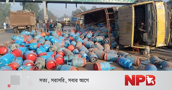 ট্রাক উল্টে রাস্তায় পড়ে যায় সিলিন্ডার। ছবি: এনপিবি