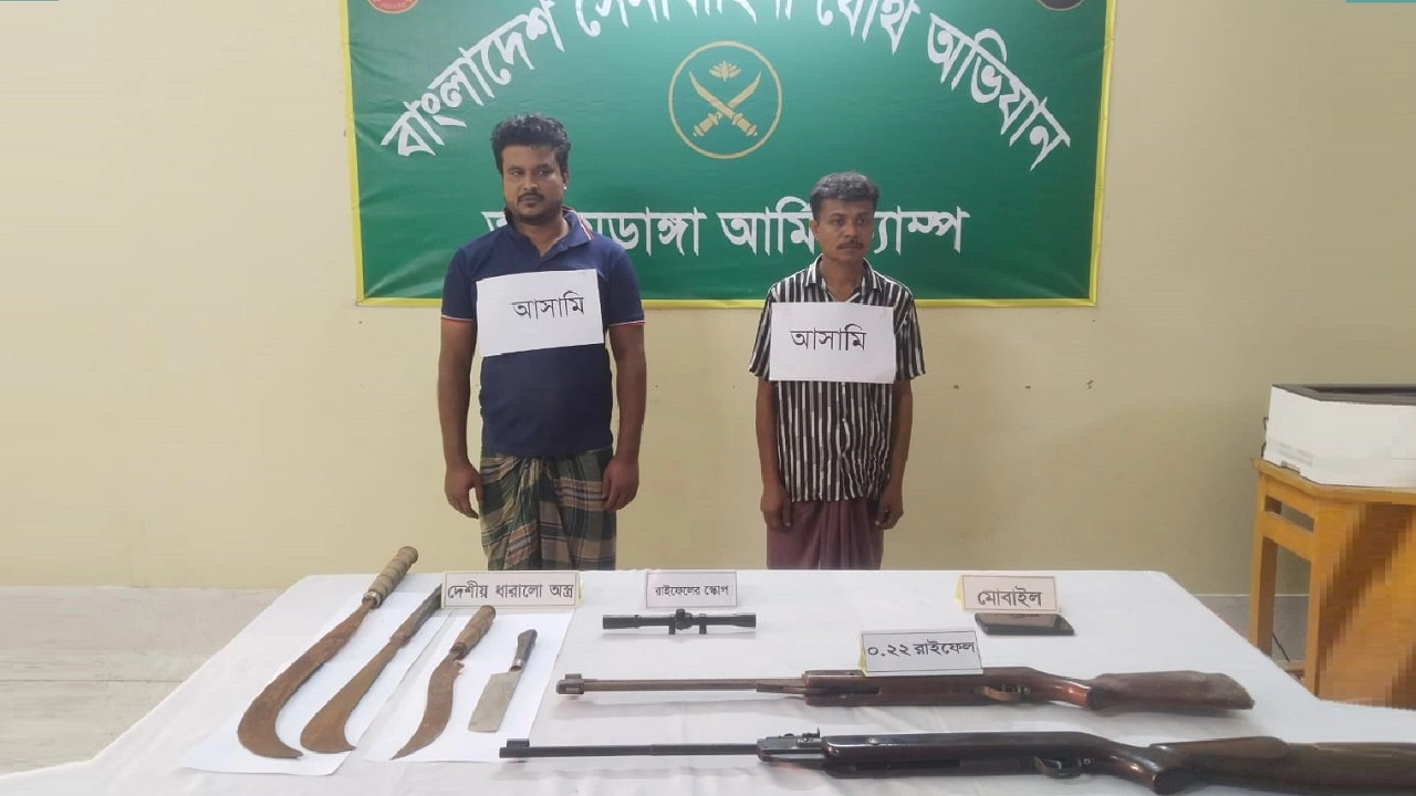চুয়াডাঙ্গার আলমডাঙ্গা উপজেলায় যৌথ বাহিনীর অভিযানে দুটি ০.২২ রাইফেল, একটি রাইফেলের স্কোপ ও চারটি দেশীয় ধারালো অস্ত্র উদ্ধার হয়েছে। এ ঘটনায় দুইজনকে আটক করেছে বাহিনী।