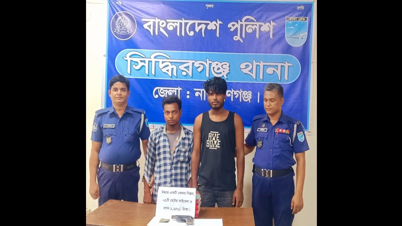 নারায়ণগঞ্জের সিদ্ধিরগঞ্জে খেলনা পিস্তলসহ দুই ছিনতাইকারীকে গ্রেফতার করেছে থানা পুলিশ। এসময় তাদের কাছ থেকে একটি খেলনা পিস্তল ও একটি রেজিস্ট্রেশনবিহীন মোটরসাইকেল এবং নগদ টাকা উদ্ধার করা হয়। সোমবার (২৭ অক্টোবর )...