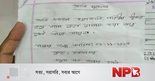 হাসপাতাল সূত্রে জানা যায়, গতকাল সন্ধ্যা ৬টা ৪০ মিনিটে শিশুটিকে ভর্তি করা হয়। ভর্তি রেজিস্ট্রারে ঠিকানা হিসেবে লেখা হয়েছে ইনছুয়ারা, শাহিনুর, আলাদিপুর, ফুলবাড়ী। চিরকুটে নবজাতকের মা লিখেছেন, “আমি মুসলিম। আমি একজন হতোভাগি। পরিস্থিতির কারণে বাচ্চা রেখে গেলাম। দয়া করে কেউ নিয়ে যাবেন। বাচ্চার জন্মতারিখ ৪ নভেম্বর ২০২৫। এগুলো সব বাচ্চার ওষুধ।”