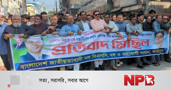 শরীফ ওসমান হাদি ও বিএনপি মনোনীত সংসদ সদস্য প্রার্থী এরশাদ উল্লাহকে সন্ত্রাসী হামলায় গুলিবিদ্ধ করার ঘটনার প্রতিবাদে ফরিদপুরে বিক্ষোভ মিছিল ও প্রতিবাদ সমাবেশ করেছে বাংলাদেশ জাতীয়তাবাদী দল (বিএনপি)।