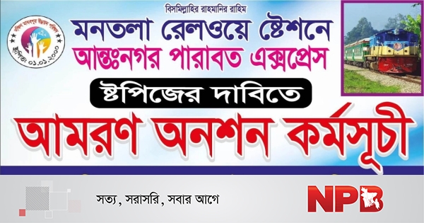 মঙ্গলবার (২৩ ডিসেম্বর) সকাল থেকে মনতলা রেলওয়ে স্টেশন প্রাঙ্গণে এ অনশন কর্মসূচি শুরু হয়। অনশন কর্মসূচিতে স্থানীয় বিভিন্ন শ্রেণি-পেশার মানুষ, শিক্ষার্থী, ব্যবসায়ী ও সামাজিক সংগঠনের প্রতিনিধিরা একাত্মতা প্রকাশ করেন।