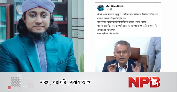 পরিবহন খাতে চাঁদাবাজি প্রসঙ্গে সড়ক পরিবহন ও সেতুমন্ত্রী শেখ রবিউল আলম এর সাম্প্রতিক মন্তব্যকে কেন্দ্র করে নতুন বিতর্ক তৈরি হয়েছে। এ বিষয়ে বক্তব্য প্রত্যাহারের আহ্বান জানিয়েছেন ইসলামী বক্তা মুফতি গিয়াস উদ্দিন আত তাহেরি।