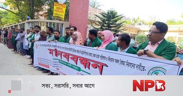 বকেয়া বেতন পরিশোধ, ১২তম গ্রেডে উন্নীতকরণ, চাকুরী প্রবিধানমালা প্রণয়নসহ ৮ দফা দাবিতে ঝিনাইদহে মানববন্ধন কর্মসূচী পালন করেছে খুলনা বিভাগের কমিউনিটি হেলথ কেয়ার প্রভাইডাররা।