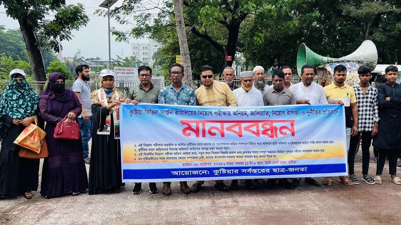 কুষ্টিয়া সিভিল সার্জন কার্যালয়ে নিয়োগ পরীক্ষায় অনিয়ম, জালিয়াতি, নিয়োগ বানিজ্য ও দূর্নীতির প্রতিবাদে মানববন্ধন অনুষ্ঠিত হয়েছে। ছাত্র জনতার ব্যানারে বৃহস্পতিবার (৩০ অক্টোবর) সকালে জেলা প্রশাসকের কার্যালয়ের সামনে এ মানববন্ধন অনুষ্ঠিত হয়। মানববন্ধনে...