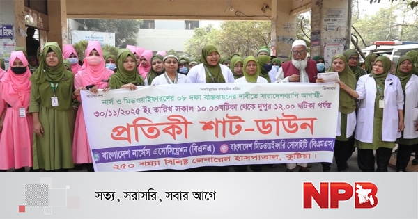 ৮ দফা দাবি আদায়ে কুষ্টিয়া জেনারেল হাসপাতাল ও মেডিকেল কলেজে প্রতিকী শাটডাউন কর্মসূচী পালন করেছে নার্স ও মিডওয়াইফার’রা।