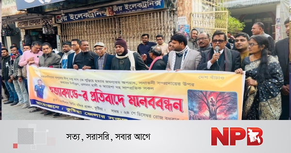 বুধবার (২৪ ডিসেম্বর) বিকেলে কুষ্টিয়া জেলার সকল সনাতনী সম্প্রদায়ের ব্যানারে শহরের গোপীনাথ জিউর মন্দিরের সামনে এ মানববন্ধন অনুষ্ঠিত হয়।