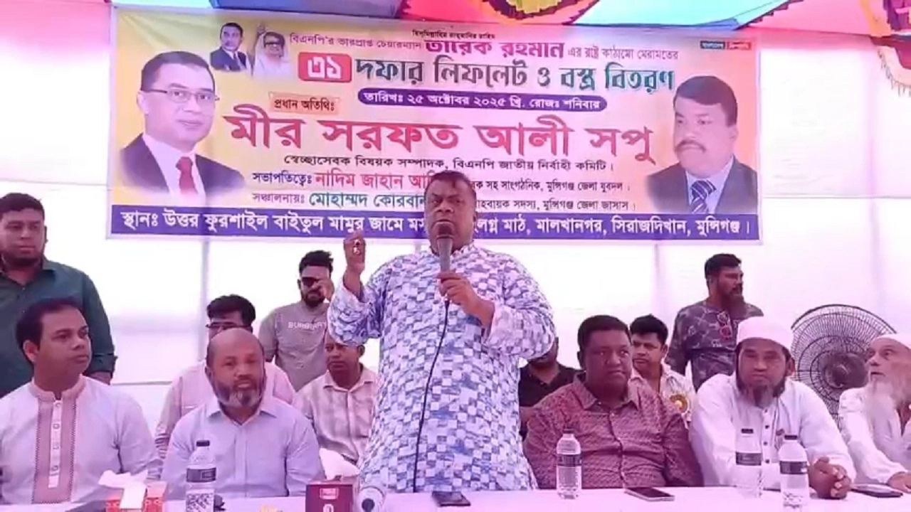 শনিবার (২৫ অক্টোবর) মুন্সীগঞ্জের সিরাজদিখান উপজেলার মালখানগর ইউনিয়নের উত্তর ফুরশাইল বাইতুল মামুর জামে মসজিদ সংলগ্ন মাঠে বিএনপির ভারপ্রাপ্ত চেয়ারম্যান তারেক রহমান ঘোষিত রাষ্ট্র কাঠামো মেরামতের ৩১ দফা লিফলেট ও বস্ত্র বিতরণ অনুষ্ঠানে প্রধান অতিথির বক্তব্যে তিনি এ মন্তব্য করেন।