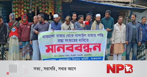 রোববার (২৮ ডিসেম্বর) দুপুরে নান্দাইল উপজেলার সিংরইল ইউনিয়নের বাকচান্দা বাজার এলাকায় সড়কের দুই পাশে দাঁড়িয়ে এ মানববন্ধন অনুষ্ঠিত হয়। কর্মসূচির আয়োজন করে জনদুর্ভোগ নিরসন কমিটি, বাকচান্দা।