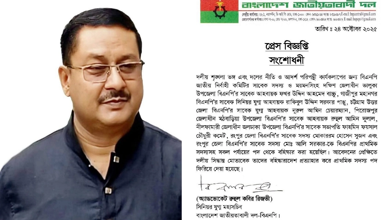বিজ্ঞপ্তিতে আরও বলা হয়, জাতীয় নির্বাহী কমিটির সাবেক সদস্য ও ময়মনসিংহ দক্ষিণ জেলাধীন ভালুকা উপজেলা বিএনপির সাবেক আহ্বায়ক ফখর উদ্দিন আহমেদ বাচ্চুকে দলীয় শৃঙ্খলা বিরোধী কর্মকান্ডে জড়িত থাকার অভিযোগে বিএনপির প্রাথমিক সদস্যসহ সকল পর্যায়ের পদ থেকে বহিষ্কার করা হয়েছিল। আবেদনের পরিপ্রেক্ষিতে দলীয় সিদ্ধান্ত মোতাবেক তার বহিষ্কারাদেশ প্রত্যাহার করে প্রাথমিক সদস্য পদ ফিরিয়ে দেয়া হয়েছে।