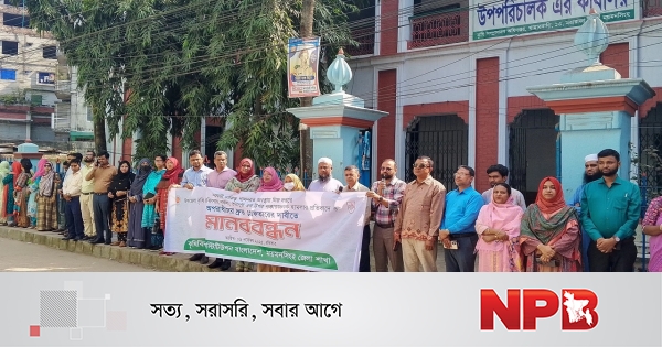ময়মনসিংহে কৃষি কর্মকর্তার ওপর হামলার প্রতিবাদে মানববন্ধন। ছবি: এনপিবি