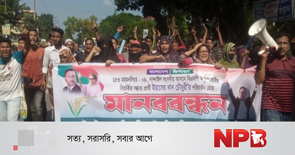 ময়মনসিংহ-০৯ (নান্দাইল) আসনে বাংলাদেশ জাতীয়তাবাদী দল (বিএনপি) কর্তৃক ঘোষিত বিতর্কিত সম্ভাব্য প্রার্থী ইয়াসের খান চৌধুরীর পরিবর্তনের দাবিতে নান্দাইলে মানববন্ধন অনুষ্ঠিত হয়েছে। শনিবার (৯ নভেম্বর) সকাল ১২টায় নান্দাইল উপজেলা সদরের শহীদ স্মৃতি আদর্শ ডিগ্রী কলেজের সামনে থেকে উপজেলা বিএনপি, পৌর বিএনপি, যুবদল, স্বেচ্ছাসেবক দল, ছাত্রদলসহ অঙ্গ ও সহযোগী সংগঠনের উদ্যোগে এ মানববন্ধন অনুষ্ঠিত হয়। মানববন্ধনে বক্তারা বলেন, ঘোষিত প্রার্থী ইয়াসের খান চৌধুরী নান্দাইলের বিএনপি নেতাকর্মীদের মধ্যে বিভাজন সৃষ্টি করেছেন। তাঁর অতীত কর্মকাণ্ডে দলের ভাবমূর্তি ক্ষুণ্ন হয়েছে বলে তাঁরা অভিযোগ করেন।