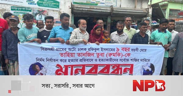 নেত্রকোনার বারহাট্টা উপজেলায় ৯ বছর বয়সী শিশু তাহিয়া তানজিন তুবা হত্যার ঘটনায় জড়িতদের দ্রুত গ্রেপ্তার ও দৃষ্টান্তমূলক শাস্তির দাবিতে মানববন্ধন ও বিক্ষোভ কর্মসূচি পালন করেছেন স্থানীয়রা।