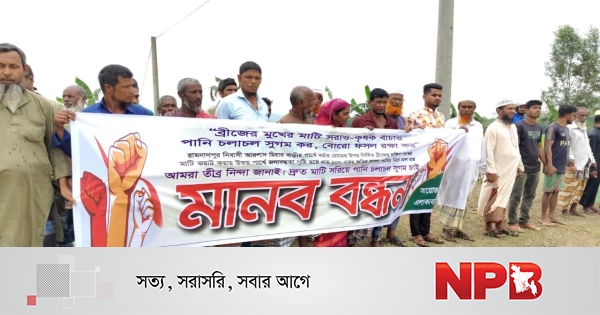 বৃহস্পতিবার (৯ এপ্রিল) দুপুর সাড়ে ১২টার দিকে রামনাথপুর এলাকার সীমান্ত সড়কের পাশে আয়োজিত এ ঘণ্টাব্যাপী মানববন্ধনে স্থানীয় কৃষকসহ বিভিন্ন শ্রেণি-পেশার মানুষ অংশ নেন। এ সময় তারা ব্যানার ও প্ল্যাকার্ড নিয়ে পানি চলাচলের পথ উন্মুক্ত করার দাবি জানান।