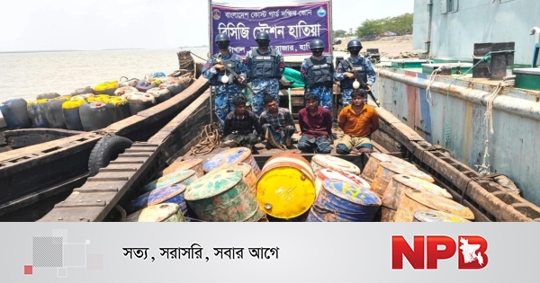 নোয়াখালীর হাতিয়ায় প্রায় ৮ লক্ষ টাকা মূল্যের ৬ হাজার ৮১৫ লিটার অবৈধ জ্বালানি তেলসহ ৪ জনকে আটক করেছে বাংলাদেশ কোস্ট গার্ড।
