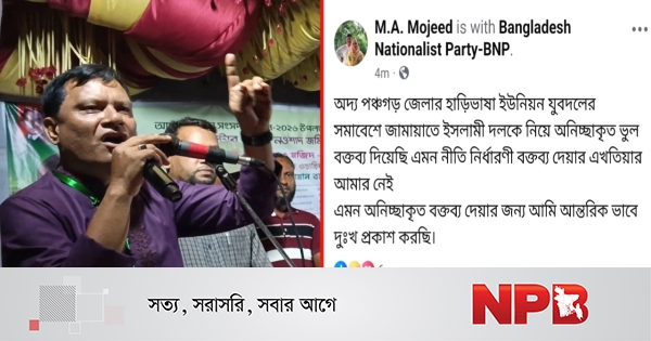 স্ট্যাটাসে তিনি লিখেন, অদ্য পঞ্চগড় জেলার হাড়িভাষা ইউনিয়ন যুবদলের সমাবেশে জামায়াতে ইসলামী দলকে নিয়ে অনিচ্ছাকৃত ভুল বক্তব্য দিয়েছি। এমন নীতি নির্ধারণী বক্তব্য দেয়ার এখতিয়ার আমার নেই। এমন অনিচ্ছাকৃত বক্তব্য দেয়ার জন্য আমি আন্তরিকভাবে দুঃখ প্রকাশ করছি।