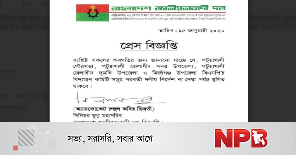 বৃহস্পতিবার (১৫ জানুয়ারি) বিএনপির সিনিয়র যুগ্ম-মহাসচিব অ্যাডভোকেট রুহুল কবির রিজভীর স্বাক্ষরিত এক প্রেসবিজ্ঞপ্তিতে এ সিদ্ধান্তের কথা জানানো হয়। একই সঙ্গে এ বিষয়ে পটুয়াখালী জেলা বিএনপির সভাপতি স্নেহাংশু সরকার কুট্টি ও সাধারণ সম্পাদক অ্যাডভোকেট মজিবুর রহমান টোটনকে চিঠি দেওয়া হয়েছে। চিঠিতে পরবর্তী দলীয় নির্দেশ না দেওয়া পর্যন্ত সংশ্লিষ্ট কমিটিগুলো স্থগিত থাকবে বলে উল্লেখ করা হয়।