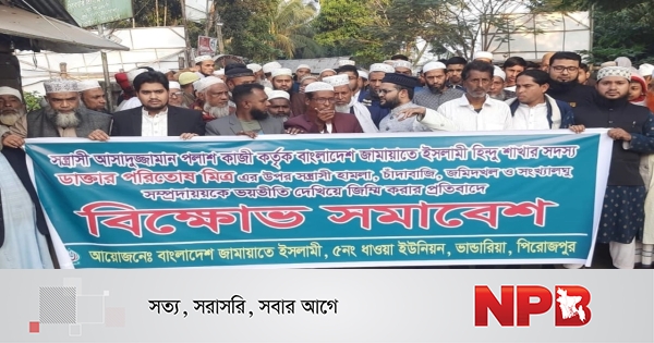 পিরোজপুরের ভান্ডারিয়ায় বাংলাদেশ জামায়াতে ইসলামী ধাওয়া ইউনিয়ন হিন্দু শাখার সদস্য ডা. পরিতোষ মিত্রের ওপর হামলা ও চাঁদাবাজির প্রতিবাদে বিক্ষোভ সমাবেশ অনুষ্ঠিত হয়েছে।