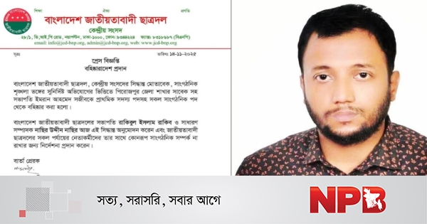 শুক্রবার (১৪ নভেম্বর) রাতে ছাত্রদলের দপ্তর সম্পাদক (সহ-সভাপতি পদমর্যাদা) মো. জাহাঙ্গীর আলম স্বাক্ষরিত এক বিজ্ঞপ্তিতে এ তথ্য জানানো হয়।