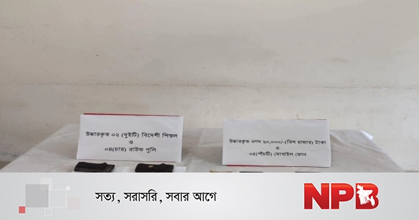 রাজবাড়ী পৌর এলাকা থেকে দুইটি বিদেশি পিস্তল, চার রাউন্ড গুলি, নগদ অর্থ, মোবাইল ফোন ও একটি প্রাইভেটকারসহ চার যুবককে গ্রেফতার করেছে জেলা গোয়েন্দা (ডিবি) পুলিশ।
