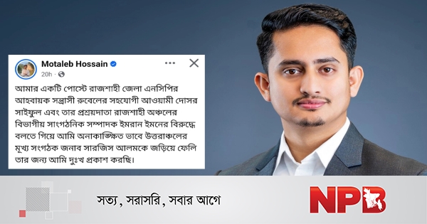শনিবার (৬ ডিসেম্বর) ফেসবুক স্ট্যাটাসে তিনি লেখেন, ‘আমার একটি পোস্টে রাজশাহী জেলা এনসিপির আহ্বায়ক সন্ত্রাসী রুবেলের সহযোগী আওয়ামী দোসর সাইফুল এবং তার প্রশ্রয়দাতা রাজশাহী অঞ্চলের বিভাগীয় সাংগঠনিক সম্পাদক ইমরান ইমনের বিরুদ্ধে বলতে গিয়ে আমি অনাকাঙ্ক্ষিতভাবে উত্তরাঞ্চলের মুখ্য সংগঠক জনাব সারজিস আলমকে জড়িয়ে ফেলি, তার জন্য আমি দুঃখ প্রকাশ করছি।’