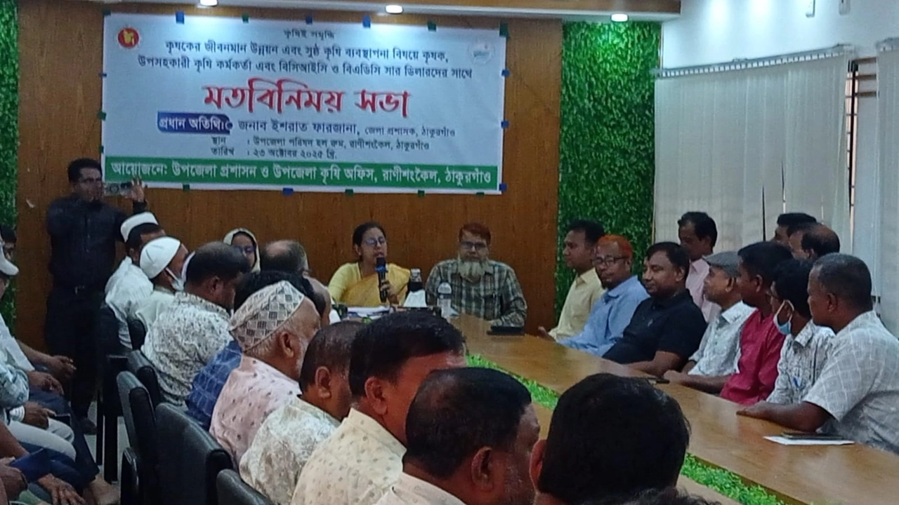 ঠাকুরগাঁও রাণীশংকৈল উপজেলা পরিষদ সভাকক্ষে বৃহস্পতিবার কৃষক,উপ-সহকারী কৃষি কর্মকর্তা এবং বিসিআইসি ও বিএডিসি সার ডিলারদের সাথে মতবিনিময় সভায় ঠাকুরগাঁও জেলা প্রশাসক ইশরাত ফারজানা বলেন, জেলায় সার সংকট নেই। চাহিদা অনুযায়ী সার...