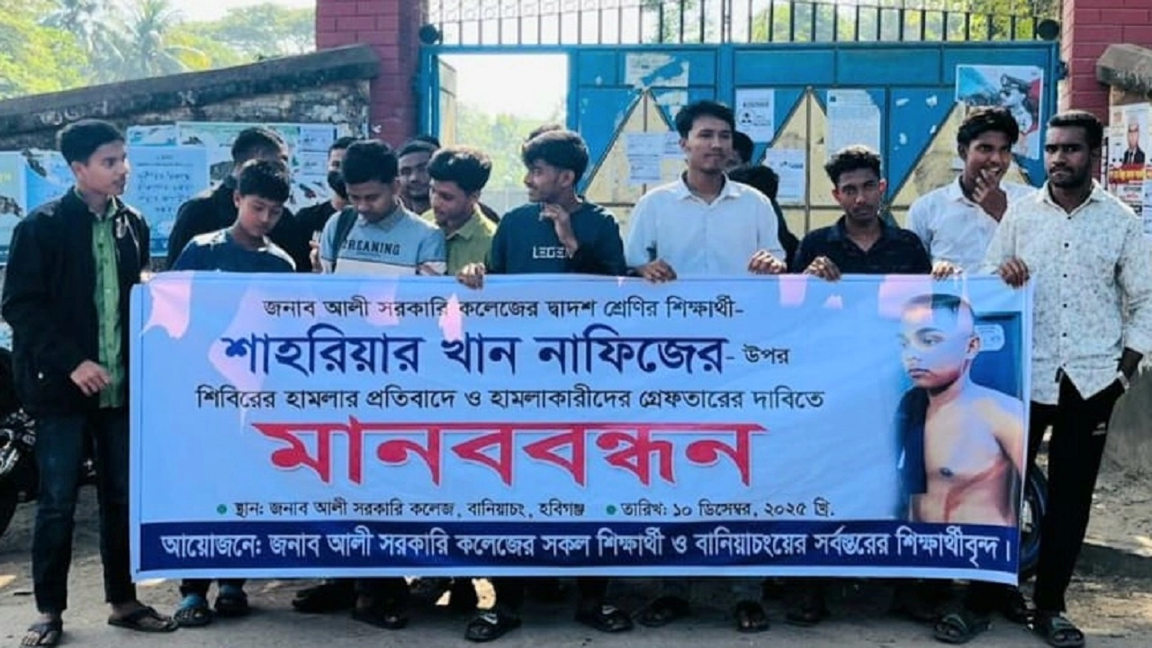 হবিগঞ্জের বানিয়াচং জনাব আলী সরকারি কলেজের দ্বাদশ শ্রেণির সাধারণ ছাত্র শাহরিয়ার খান নাফিজের উপর ছাত্র শিবিরের হামলার প্রতিবাদে ও হামলাকারীদের গ্রেফতারের দাবিতে মানববন্ধন অনুষ্ঠিত হয়েছে।