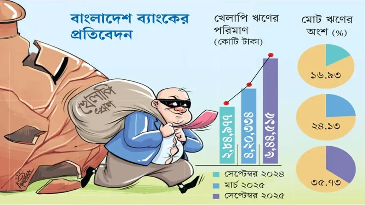 দেশের ব্যাংক খাতে খেলাপি ঋণ এক বছরে দ্রুত বৃদ্ধি পেয়েছে। বর্তমানে মোট বিতরণকৃত ঋণের প্রায় ৩৬ শতাংশ খেলাপি। সেপ্টেম্বরের শেষ পর্যন্ত ব্যাংকগুলোর খেলাপি ঋণ দাঁড়িয়েছে ৬ লাখ ৪৪ হাজার ৫১৫ কোটি...