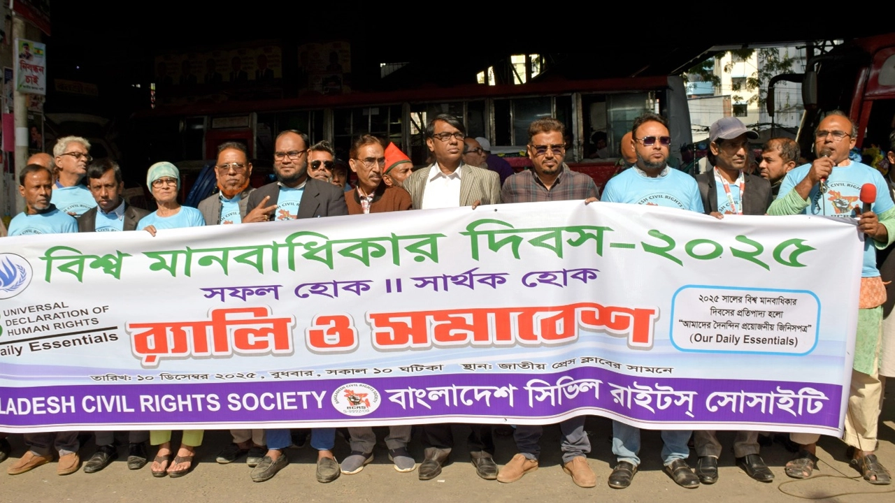 ‘আমাদের দৈনন্দিন প্রয়োজনীয় জিনিসপত্র’ (Our Daily Essentials)-এই গুরুত্বপূর্ণ প্রতিপাদ্যকে সামনে রেখে বাংলাদেশ সিভিল রাইটস সোসাইটি (বিসিআরএস)-এর উদ্যোগে পালিত হলো বিশ্ব মানবাধিকার দিবস-২০২৫। মানুষের মৌলিক চাহিদা পূরণে খাদ্য, পানি, বাসস্থান, স্বাস্থ্যসেবা ও...