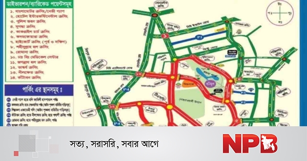 ডিএমপি জানায়, মঙ্গলবার (১৪ এপ্রিল) ভোর ৫টা থেকে পরবর্তী নির্দেশনা না দেয়া পর্যন্ত নিচের পয়েন্টগুলোতে ডাইভারশন চলবে: বাংলামোটর, হোটেল ইন্টারকন্টিনেন্টাল ও পুলিশ ভবন; সুগন্ধা, কাকরাইল চার্চ ও কদম ফোয়ারা; হাইকোর্ট (পশ্চিম), শহীদুল্লাহ হল ও রোমানা ক্রসিং; ঢাকা বিশ্ববিদ্যালয় মেডিকেল সেন্টার, জগন্নাথ হল ও ভাস্কর্য ক্রসিং এবং নীলক্ষেত ও কাঁটাবন ক্রসিং। বিকল্প সড়ক ব্যবহারের নির্দেশনা