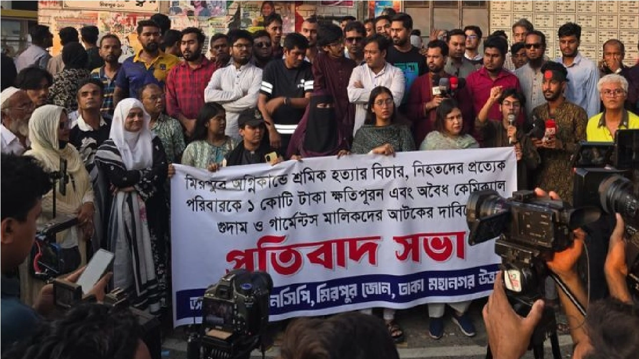 রাজধানীর মিরপুরে রাসায়নিকের অবৈধ গুদাম ও একটি পোশাক কারখানায় অগ্নিকাণ্ডে ১৬ শ্রমিক নিহতের ঘটনায় বিচার ও ক্ষতিপূরণ দাবি জানিয়েছে জাতীয় নাগরিক পার্টি (এনসিপি)।