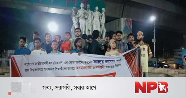 ঢাকা বিশ্ববিদ্যালয়ে অধ্যয়নরত মাদ্রাসা শিক্ষার্থীদের ব্যাপারে অবমাননাকর ও বর্ণবাদী মন্তব্যের প্রতিবাদে বিএনপি চেয়ারপার্সনের উপদেষ্টা ফজলুর রহমানকে ক্ষমা চাওয়ার আহ্বান জানিয়ে মানববন্ধন করেছে ঢাকা বিশ্ববিদ্যালয় কেন্দ্রীয় ছাত্র সংসদের (ডাকসু) নবনির্বাচিত প্রতিনিধিরা।