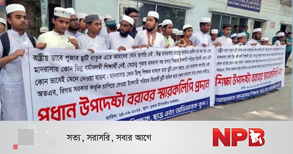 বুধবার (২৪ সেপ্টেম্বর) মাদ্রাসায় দুর্গাপূজার ছুটি বাতিলের জন্য আবেদন করেন তারা।