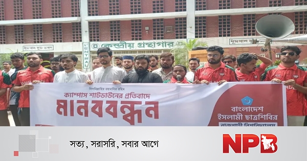 রাজশাহী বিশ্ববিদ্যালয়ে (রাবি) শিক্ষক, কর্মকর্তা কর্মচারী পূর্ণাঙ্গ শাটডাউনের প্রতিবাদে মানববন্ধন করেছে শাখা ছাত্রশিবির।