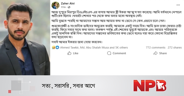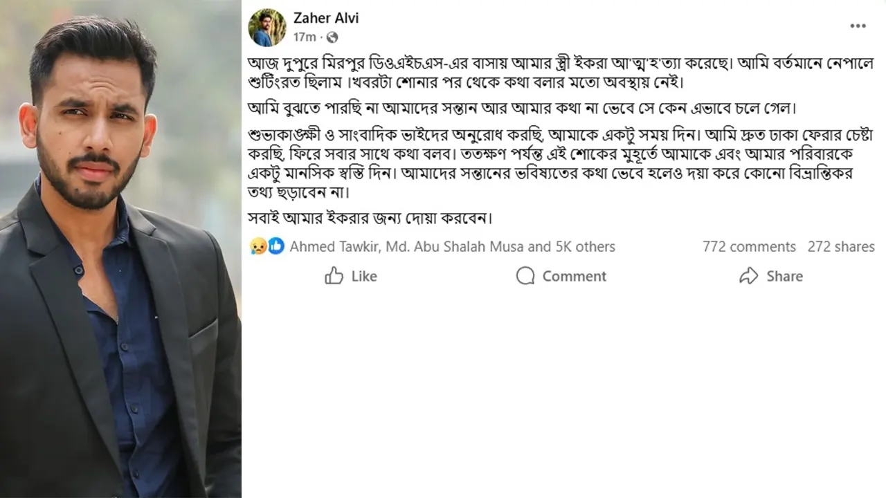 স্ত্রী আফরা ইভনাথ খান ইকরার আত্মহত্যা নিয়ে এবার ফেসবুকে পোস্ট করেছেন অভিনেতা জাহের আলভী। স্ত্রীর মৃত্যুর খবর নিশ্চিত করে তিনি লেখেন, ‘আজ দুপুরে মিরপুর ডিওএইচএসের বাসায় আমার স্ত্রী ইকরা আত্মহত্যা করেছে।