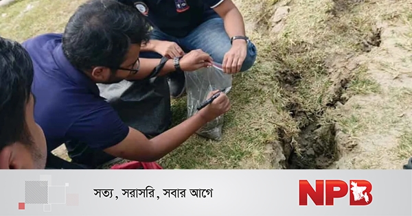 নরসিংদীর ঘোড়াশালের বিভিন্ন এলাকায় ভূমিকম্পের পর দেখা দেওয়া মাটির ফাটল থেকে নমুনা সংগ্রহ করেছে ঢাকা বিশ্ববিদ্যালয়ের ভূতত্ত্ব বিভাগ।