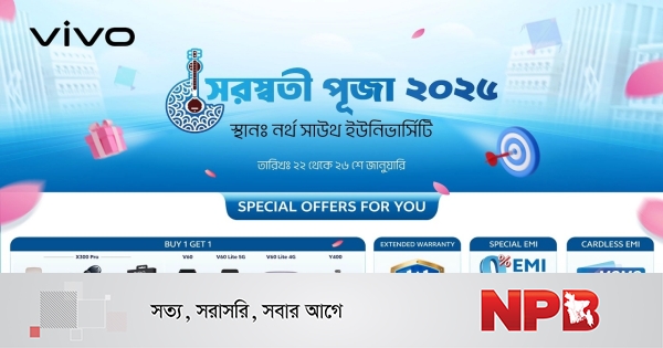 নর্থ সাউথ ইউনিভার্সিটির ‘সরস্বতী পূজা ২০২৬’-এর টাইটেল স্পন্সর হিসেবে গ্লোবাল স্মার্টফোন ব্র্যান্ড ভিভো নিয়ে এসেছে দারুণ সব টেক-অভিজ্ঞতা এবং এক্সক্লুসিভ অফার। উৎসবের প্রতিটি দিন আরও উৎসবমুখর ও স্মরণীয় করতে ক্যাম্পাসজুড়ে থাকছে ভিভোর বিশেষ আয়োজন।