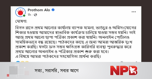 এতে উল্লেখ করা হয়, ১৮ ডিসেম্বর রাতে প্রথম আলোর কার্যালয় ব্যাপক হামলা, ভাঙচুর ও অগ্নিসংযোগের শিকার হওয়ায় স্বাভাবিক কার্যক্রম চালিয়ে যাওয়া সম্ভব হয়নি।