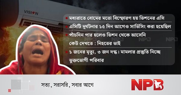 এ বিষয়ে ভুক্তভোগীর ভাই মো. মাহিন এনপিবি নিউজকে বলেন, ভিশনের এসিটা মধ্যরাতে বোমের মতো বিস্ফোরণ হয়। এরপরে সারা ঘরে আগুন ধরে যায়। এসিটি ১৫ দিন আগেও সার্ভিসিং করা হয়েছিল। তারপরেও এই দুর্ঘটনা ঘটে। তাছাড়া, এতো বড় একটি ঘটনা ঘটেছে তবুও ভিশন থেকে এখনো কেউ আসেনি দগ্ধ পরিবারটিকে দেখতে। পরিবারের বাকি সদস্য যারা দগ্ধ তাদের নিয়ে এখন দুশচিন্তার মধ্যে আছি।