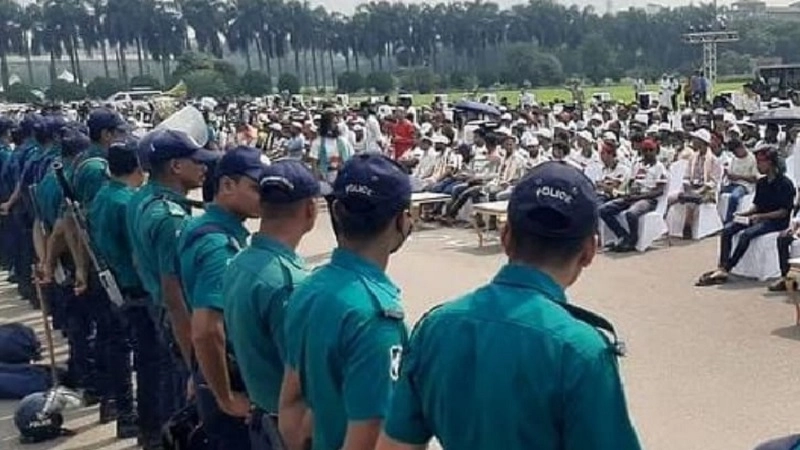 সকাল ১১টার দিকে তারা প্রবেশ করলে পুলিশ মঞ্চ ও আন্দোলনকারীদের মাঝে অবস্থান নিয়ে নিরাপত্তা রক্ষা করে।
