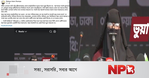 ঢাকা-১১ আসনে জামায়াতে ইসলামী সমর্থিত ১১ দলীয় জোটের নির্বাচনী সমাবেশে শরীফ ওসমান হাদির বোন পরিচয়ে বক্তব্য দেওয়া এক নারীকে ঘিরে বিভ্রান্তি তৈরি হয়েছে। শবনম খাদিজা নামের ওই নারী সমাবেশে নাহিদ ইসলামের পক্ষে ভোট চান। তবে তিনি সত্যিই ওসমান হাদির বোন কি না, তা নিয়ে প্রশ্ন উঠেছে।