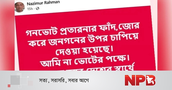 নাজিমুর রহমান ফেসবুক পোস্টে লেখেন, ‘গণভোট প্রতারণার ফাঁদ, জোর করে জনগণের ওপর চাপিয়ে দেওয়া হয়েছে। আমি না ভোটের পক্ষে। গণতন্ত্র আর দেশের স্বার্থে আপনিও না ভোট দিন।’