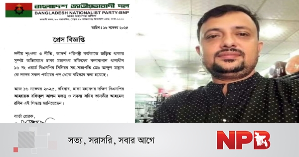 ঢাকা মহানগর দক্ষিণ বিএনপির আহ্বায়ক রফিকুল আলম মজনু এবং সদস্য সচিব তানভীর আহমেদ রবিন যৌথভাবে স্বাক্ষরিত সিদ্ধান্তে বহিষ্কারের বিষয়টি জানানো হয়।