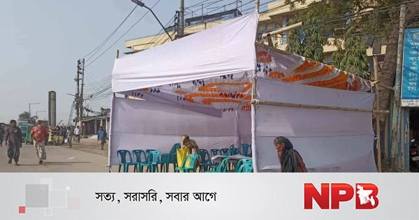 সাদা কাপড়ে একটি প্যান্ডেল তৈরি করা হয়েছে। এর ভিতরে চেয়ার বসানো হয়েছে, মাঝখানে একটি টেবিল রাখা হয়েছে এবং টেবিলের চারপাশেও চেয়ার বসানো হয়েছে।