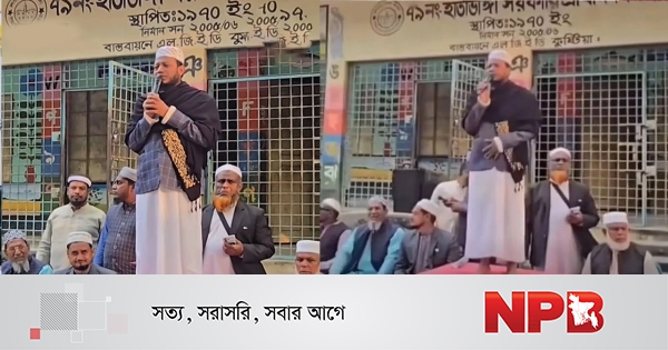 ভিডিওতে দেখা যায়—কুষ্টিয়ার একটি শিক্ষাপ্রতিষ্ঠানের সামনে টেবিলের উপর দাঁড়িয়ে তিনি নির্বাচনী বক্তব্য দিচ্ছেন, আর তার পাশের চেয়ারে কয়েকজন লোক বসে আছেন।